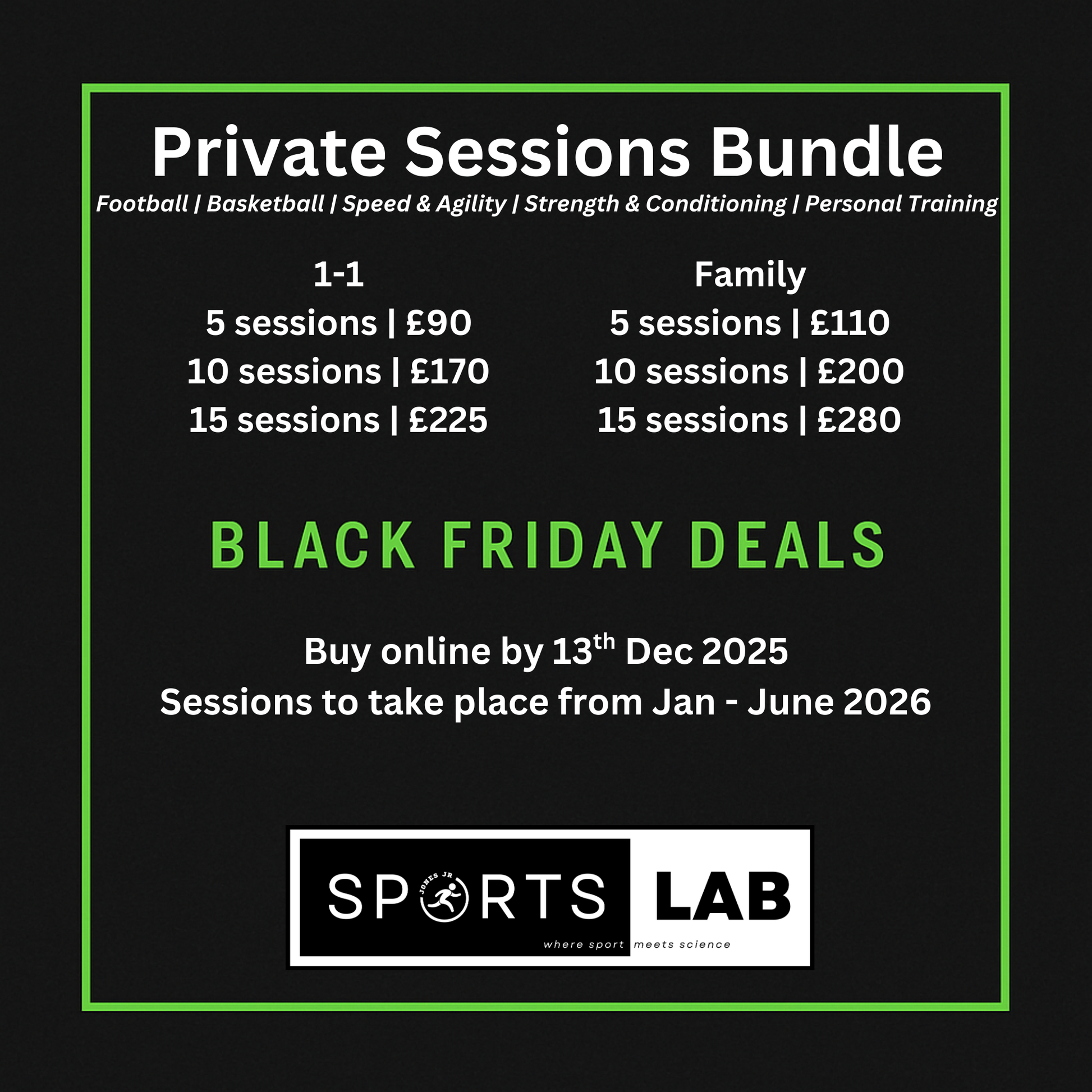 Sessions are 45 minutes and can focus on Football, Basketball, Speed & Agility, Strength & Conditioning or Personal Training